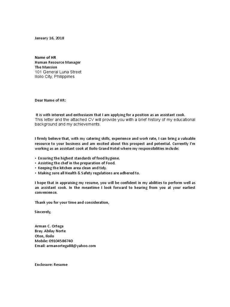 A few kinds of chef job positions where you may use our job application letters in your application processes are as follows:. Kitchen assistant cover letter kitchen assistants work under the supervision of cooks and are responsible for basic food preparation and cleaning. Sous chef position, waves restaurant. In your letter, reference your most relevant or exceptional qualifications to help employers see why you're a great fit for the role. An engaging assistant chef cover letter can help you grab an employer's attention, which can lead to landing an interview for a job.